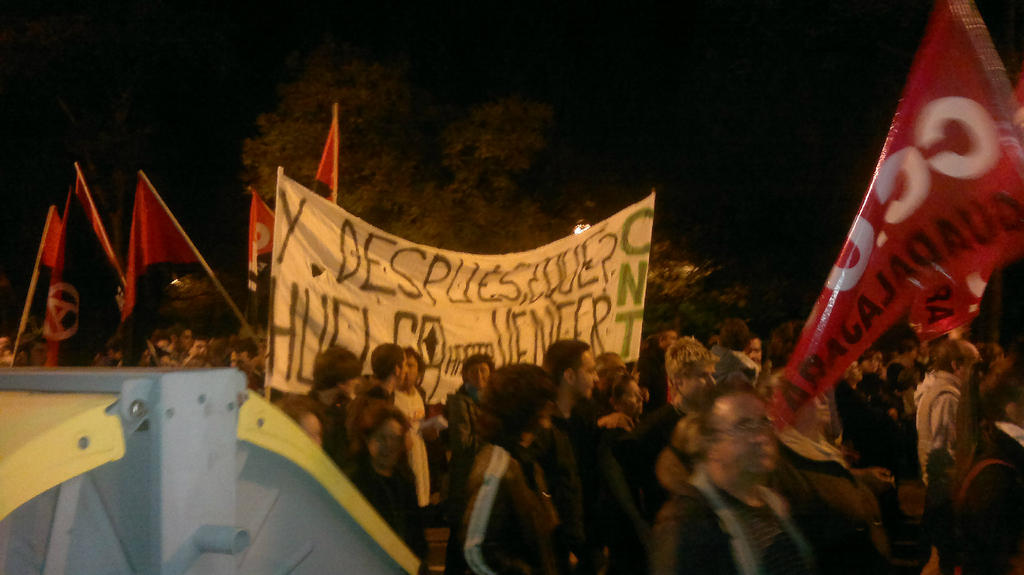 12:00h: Concentración en la Subdelegación del Gobierno: En torno al millar de personas de congregaba al mediodía en la Subdelegación. Desde el bloque crítico se ha tomado la calzada y se han empezado los cánticos en un ambiente bastante combativo. Se han leído discursos desde cada uno de los colectivos participantes anticipándose a los comunicados de los secretarios de los mayoritarios. Un compa de CNT ha lanzado las arengas mejor recibidas de la mañana desde la tribuna de éstos.
